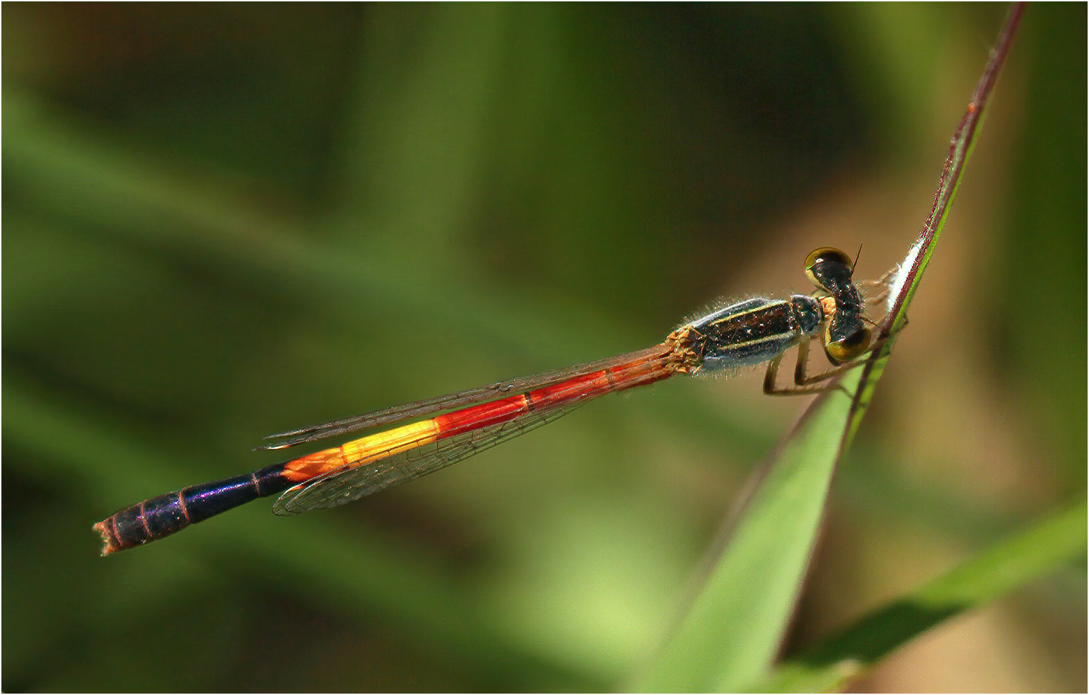 J'ai eu un vrai plaisir d'odonatophile à découvrir de façon inattendue ce mâle Ischnura nursei, à Udaipur, le 6 novembre 2016. Il se tenait dans les herbes basses, le long d'un muret bas qui le séparait des eaux du lac Pichola, en compagnie d'Agriocnemis pygmaea, Ischnura senegalensis et rubilio (ex aurora). Mais quand on prospecte plié en deux il est difficile de le manquer, pour le rouge mais surtout pour le jaune incandescent de son abdomen. La photo de gauche, pas très nette montre qu'il est rouge aussi sous les derniers segments, ce qui est assez étonnant car la face dorsale est noire. Sur toutes mes photos (et celle des autres!) ces derniers segments sont d'ailleurs fléchis, donnant à ces segments une concavité inférieure. Doit-on y voir une sorte de "catadioptre" comme pour nos Calopteryx européens ?