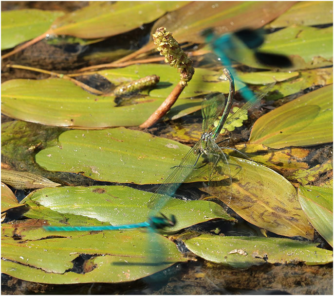 Ce 26 juillet 2012 les mâles sont nombreux et actifs, sur la rive droite de l'Evre, au soleil dans les herbes. Les femelles sont discrètement perchées dans les arbustes de la rive opposée, à mi-ombre. Dès qu'une femelle tente de traverser l'espace des mâles elle est aussitôt prise en chasse par 4 ou 5 prétendants à l'accouplement. Quand une femelle parvient à déjouer la surveillance des mâles elle s'installe pour pondre sur les potamots. Mais la pause est brève pour elle et elle doit déjouer les incessants assauts des mâles qui tentent de l'attrapper par le prothorax pour s'accoupler.