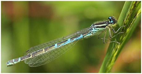 La pilosité du thorax mais surtout des 3 premiers segments abdominaux est étonnante; c'est certainement le coenagrion le plus poilu (le mâle présente la même particularité)!