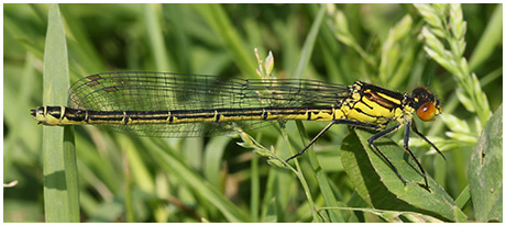 Les yeux moins rouges que ceux du mâle sont également pourvus de jaune. Il n'y a pas de tache sur les derniers segments abdominaux.