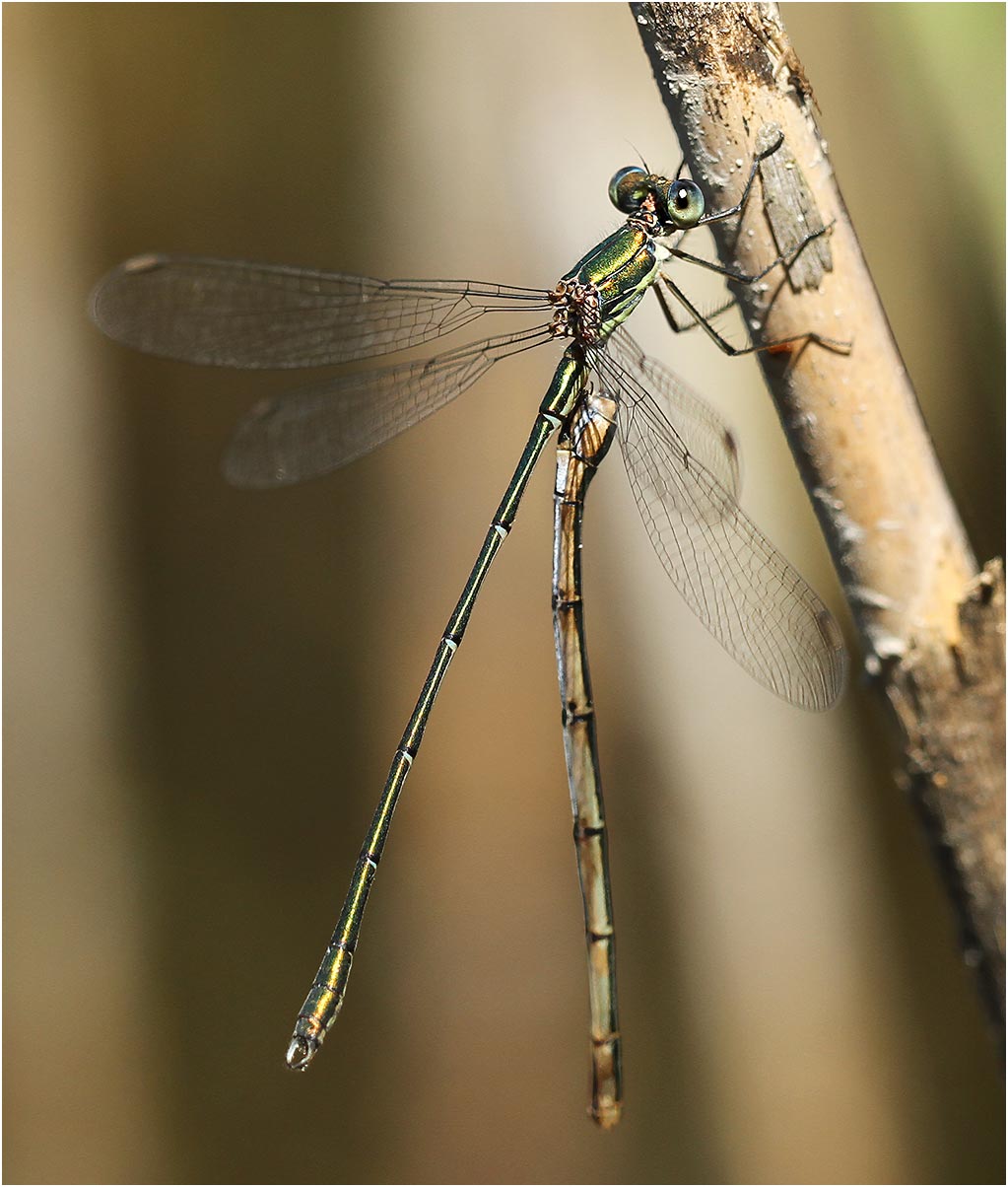 Il y avait beaucoup de Lestes viridis ce 15 août 2013 sur les rives de l'étang de Chevigné à St Georges sur Loire. J'ai eu la surprise d'apercevoir un mâle qui volait curieusement, une brindille me semblait-il accrochée au thorax,. Non, il s'agit bien de l'abdomen d'une femelle qui a été dévorée pendant un accouplement, resté accroché à l'hameçon du mâle et qui oscillait dans le vent lorsqu'il était posé.