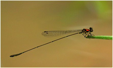 C'est au dessus d'un ruisseau très à l'ombre, un minuscule tributaire de l'Amazone, à 10 mètres du fleuve, que j'ai rencontré ce très rare, magnifique et spectaculaire Protoneura scintilla, le 21 mars 2017 tout près du Lodge Calanoa (Leticia, Amazonas). Ses marques thoraciques orange permettent de le repérer plus facilement dans la pénombre. C'est sans doute un sujet un peu particulier car les 2 seuls que j'ai pu voir sur le Web ont des bandes antéhumérales jaunes, non orange et la description qu'on trouve dans le Heckman donne ces bandes effectivement pâles. Il mesure environ 32 mm avec un thorax minuscule et un abdomen démesuré, se rencontre sur les parties calmes des ruisseaux forestiers, en Equateur, Pérou et Colombie, et certainement au Brésil.