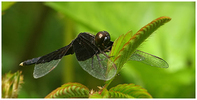 En haut mais surtout à droite (agrandir la photo) ce mâle s'est posé sur une feuille de sensitive, cette petite plante rampante dont les feuilles ont la propriété (thigmonastie !) de se replier au mondre contact.