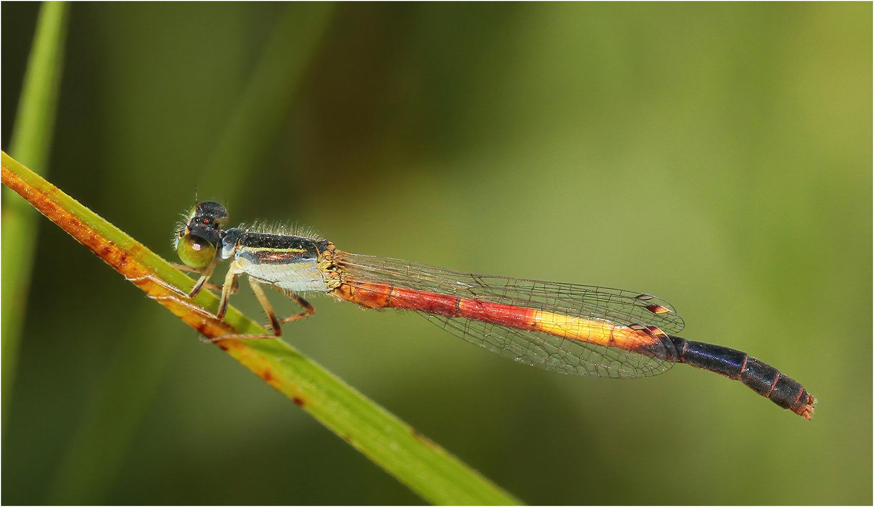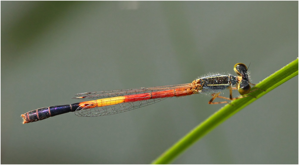 J'ai eu un vrai plaisir d'odonatophile à découvrir de façon inattendue ce mâle Ischnura nursei, à Udaipur, le 6 novembre 2016. Il se tenait dans les herbes basses, le long d'un muret bas qui le séparait des eaux du lac Pichola, en compagnie d'Agriocnemis pygmaea, Ischnura senegalensis et rubilio (ex aurora). Mais quand on prospecte plié en deux il est difficile de le manquer, pour le rouge mais surtout pour le jaune incandescent de son abdomen. La photo de gauche, pas très nette montre qu'il est rouge aussi sous les derniers segments, ce qui est assez étonnant car la face dorsale est noire. Sur toutes mes photos (et celle des autres!) ces derniers segments sont d'ailleurs fléchis, donnant à ces segments une concavité inférieure. Doit-on y voir une sorte de "catadioptre" comme pour nos Calopteryx européens ?