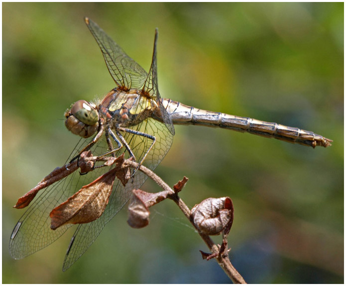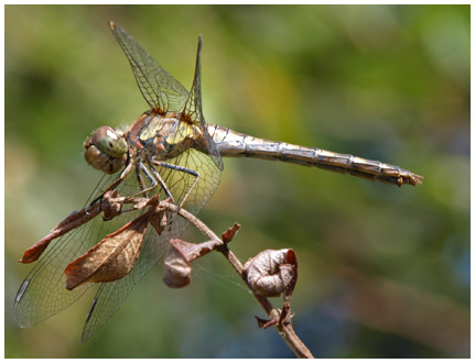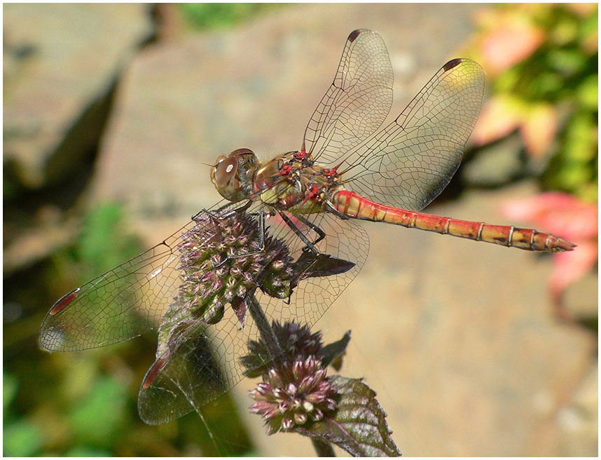 Le sympetrum striolatum tire son nom de ses fémurs et tibias noirs plus ou moins discrètement rayés d'une ligne jaune.
