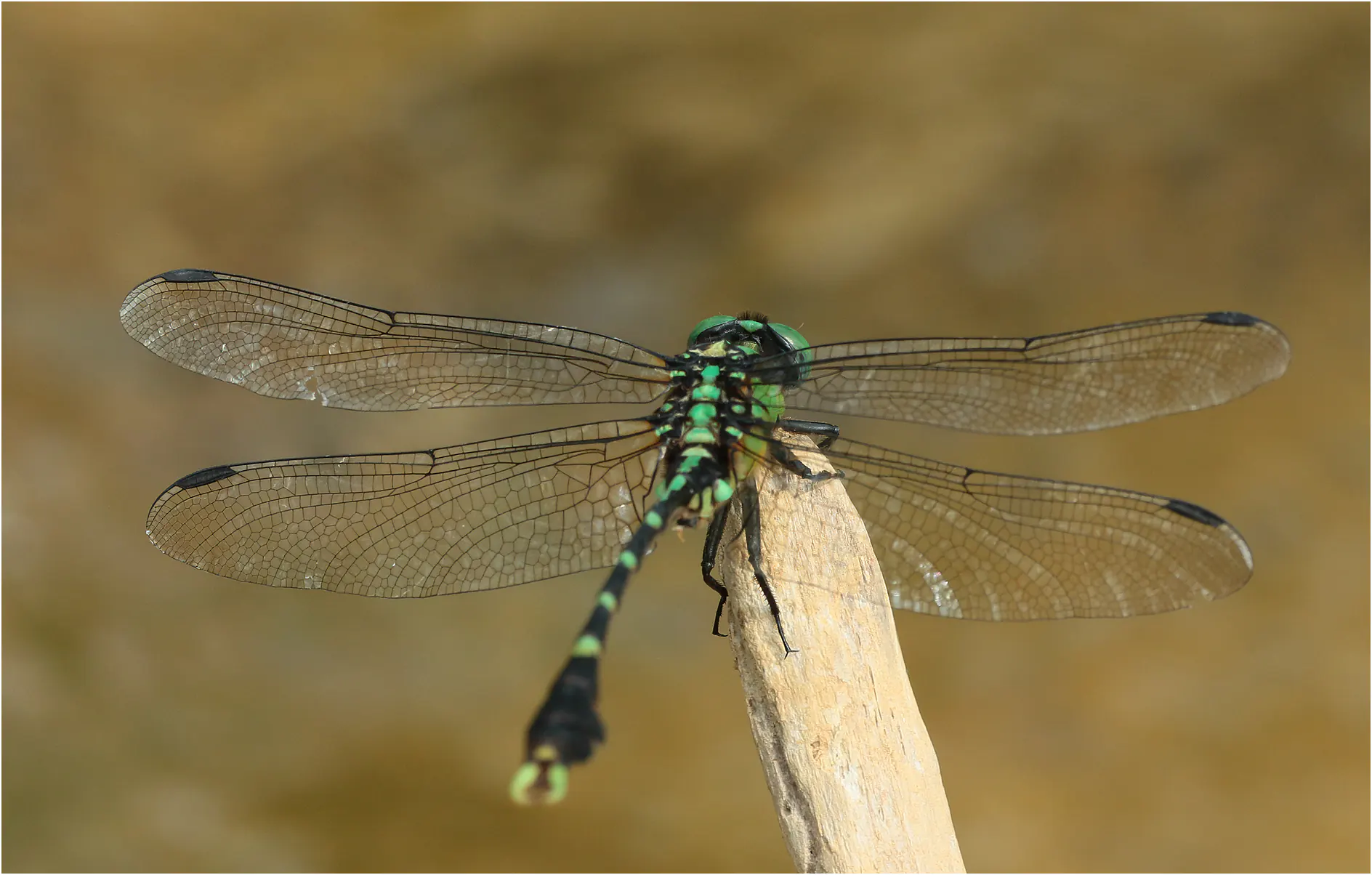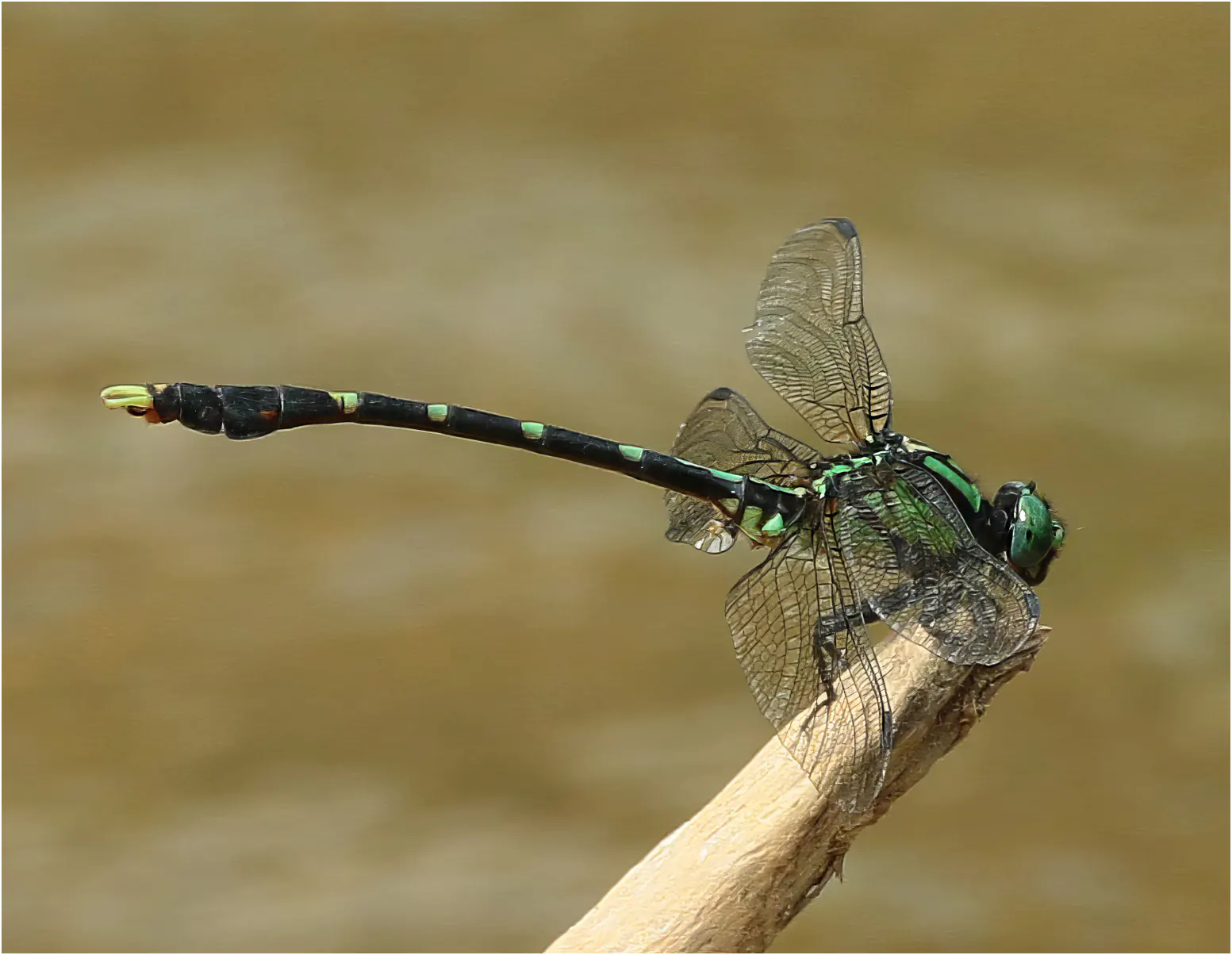Nihonogomphus thomassoni mesure environ 62 mm (abdomen + appendices anaux 44 mm(1)) et aime à se poser sur un rocher ou un support émergent de la rivière pour surveiller son territoire.