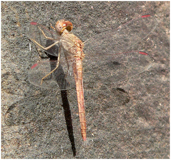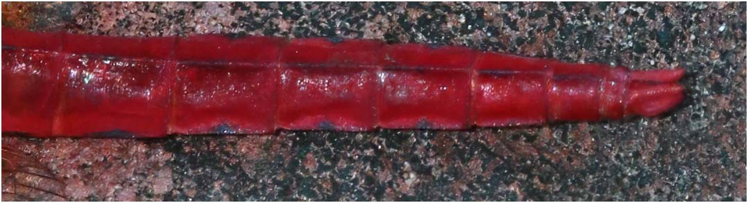 Mais surtout elles diffèrent de C. erythraea par leur lame vulvaire; alors que celle de cette dernière est pratiquement perpendiculaire à l’abdomen, celle de Crocothemis sanguinolenta, bien visible également de profil, est longue et pointe vers l’arrière (sous les 9° et 10° segments). Malheureusement, je n’ai pas cette vue sur un sujet vivant, seulement sur cette photo de ce sujet piégé par une graminée, Setaria verticillata.