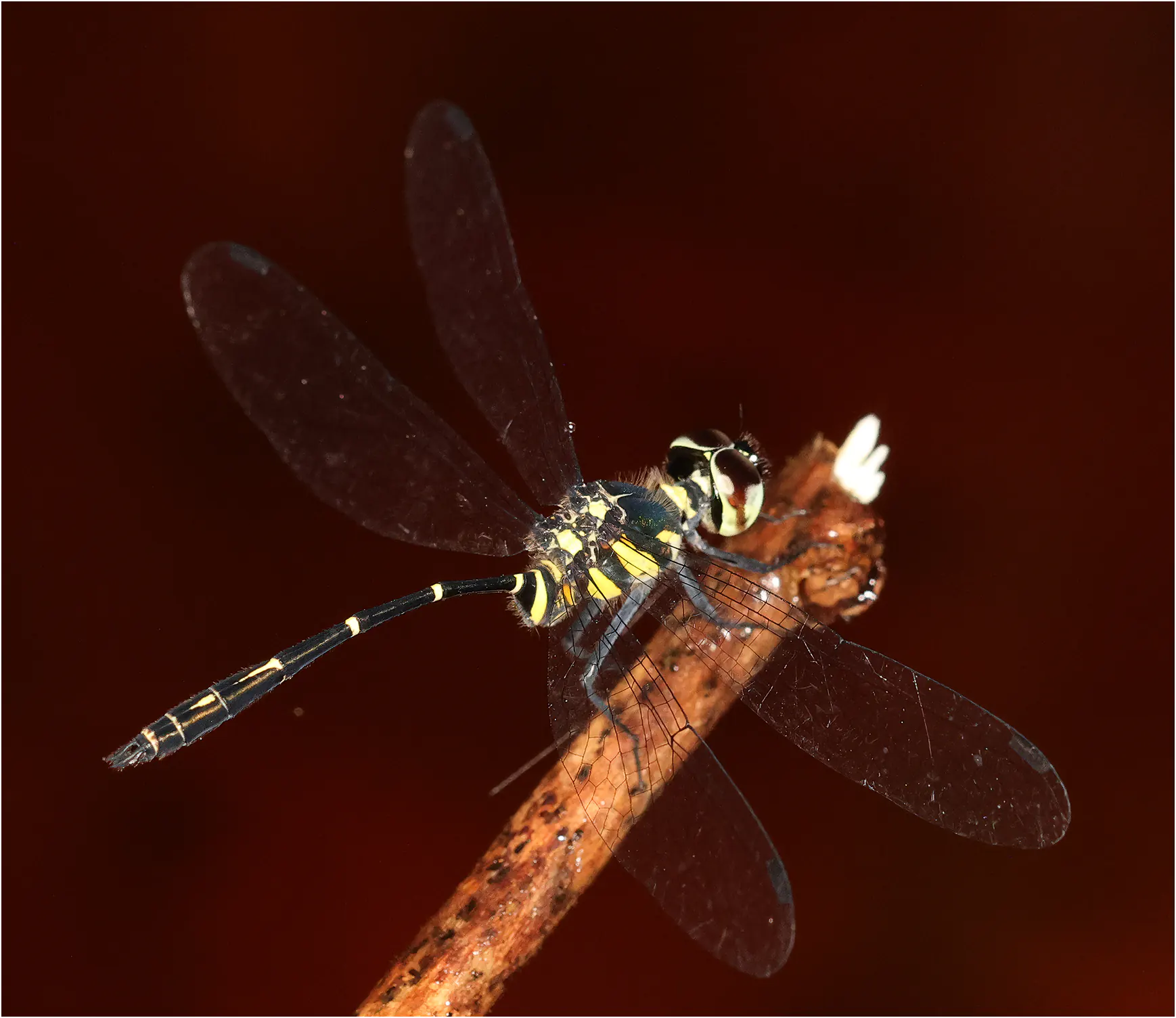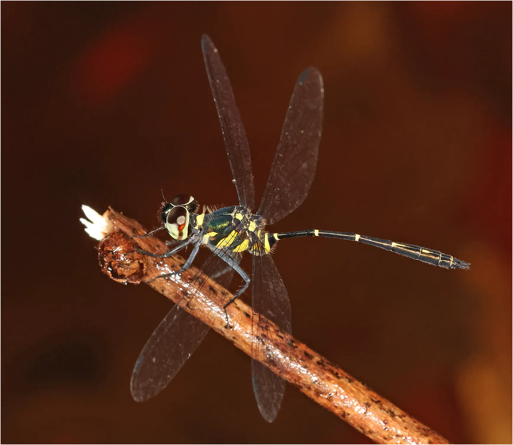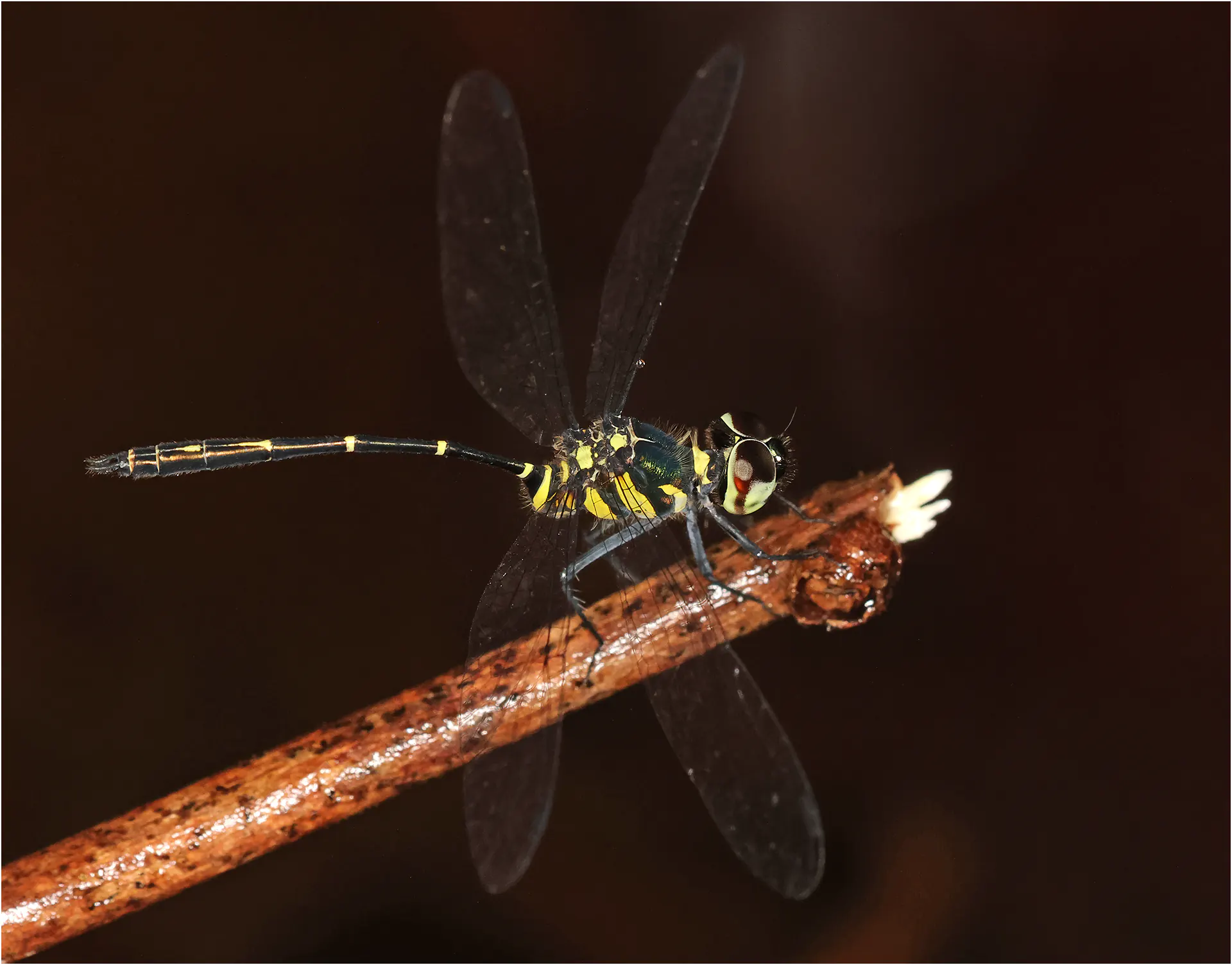 Risiophlebia dohrni est un rare petit Libellulidae qui fréquente les forêts marécageuses d’eau douce ou des tourbières des zones de basse altitude. J’ai repéré celui-ci, le seul que j’ai pu photographier, dans une zone boisée sombre d’un parc de Kuching. La rencontre a été brève et nous l’avons très rapidement perdu dans l’ombre…
