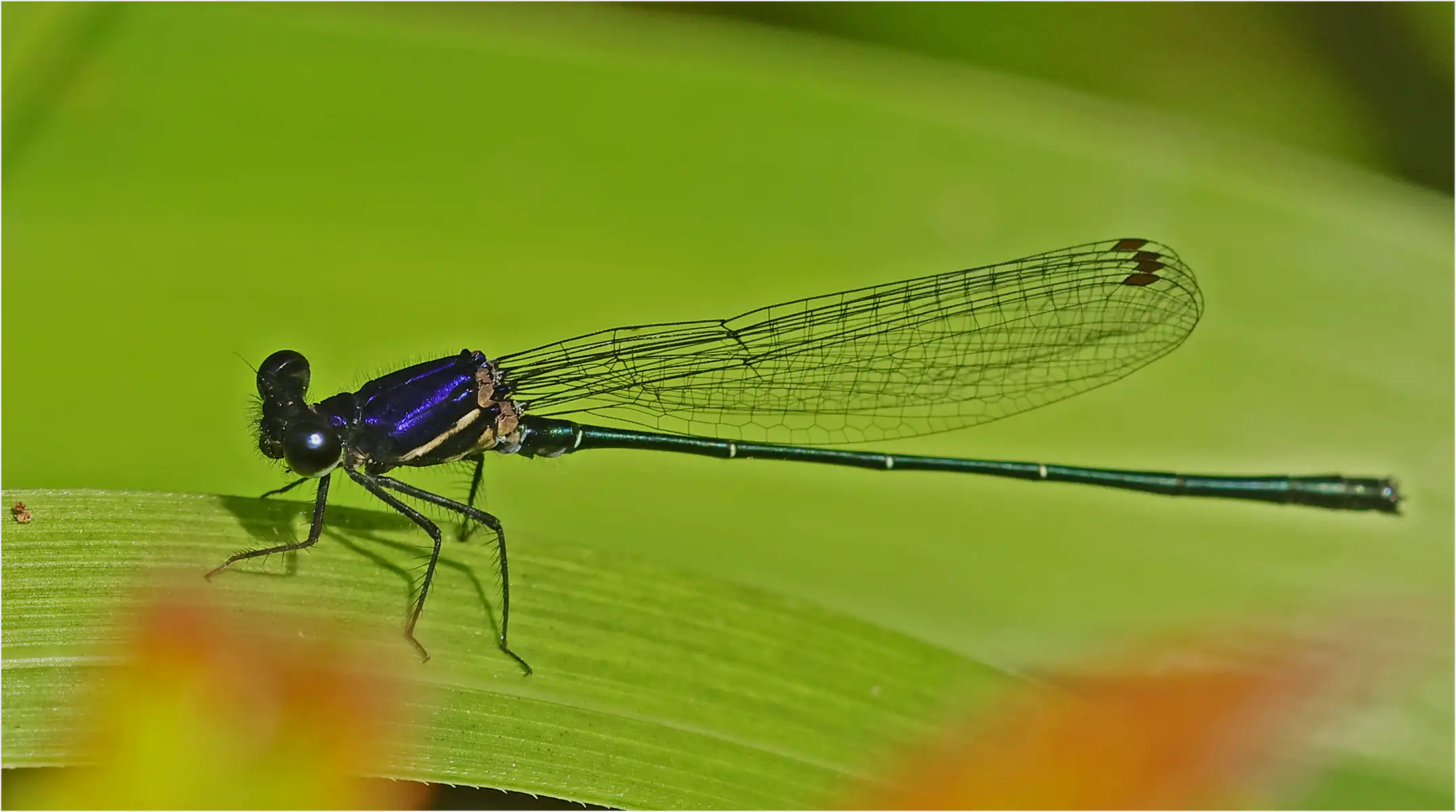 À Bornéo, c’était la quatrième fois que je rencontrais Onychargia atrocyana, mais c’est tout de même une découverte pour moi, à double titre ; je n’avais jamais rencontré de mâle isolé (ce qui est étonnant), hors tandem et je n’avais jamais pu constater ces refllets bleus qui lui valent son nom d’espèce.