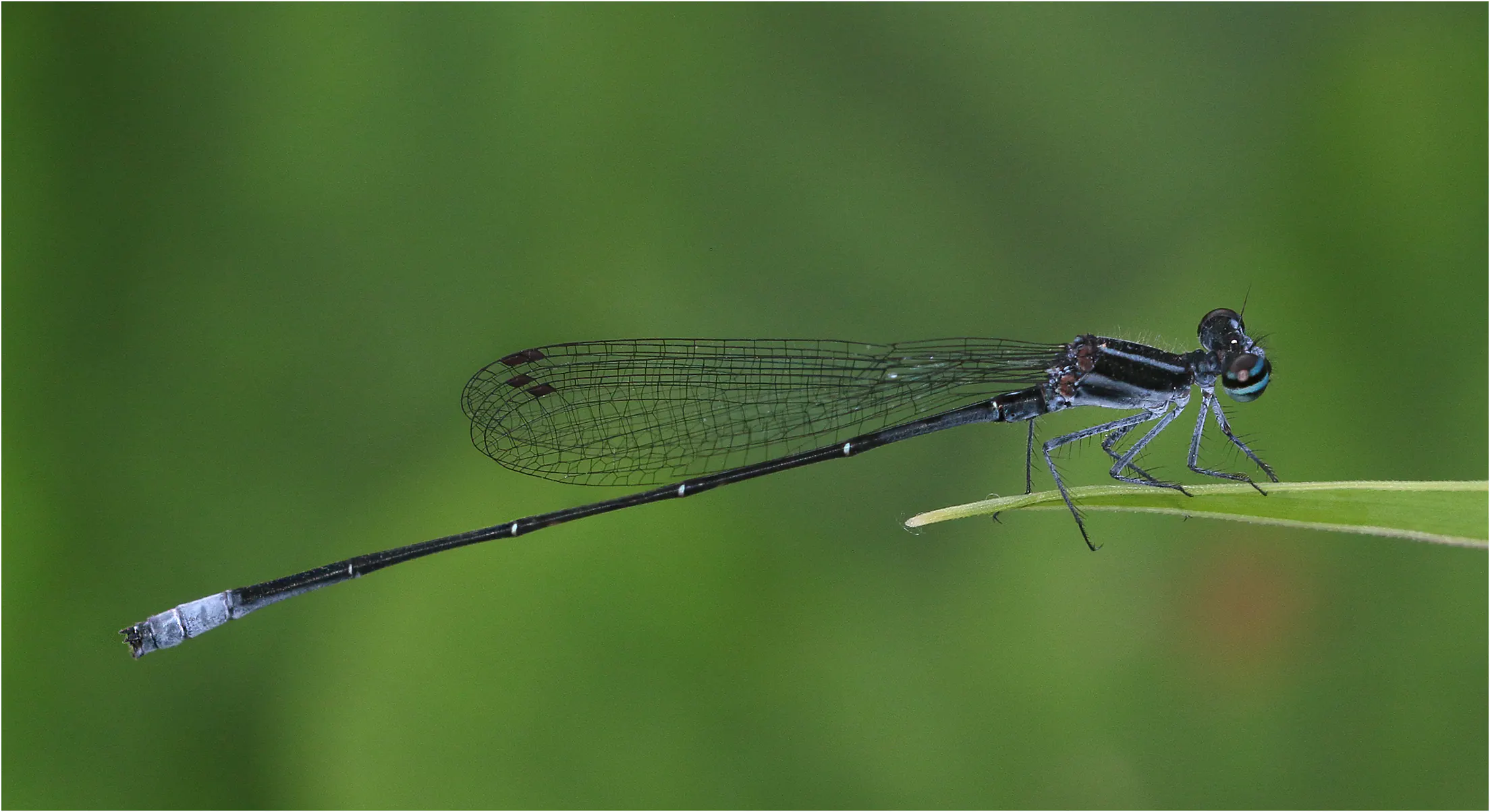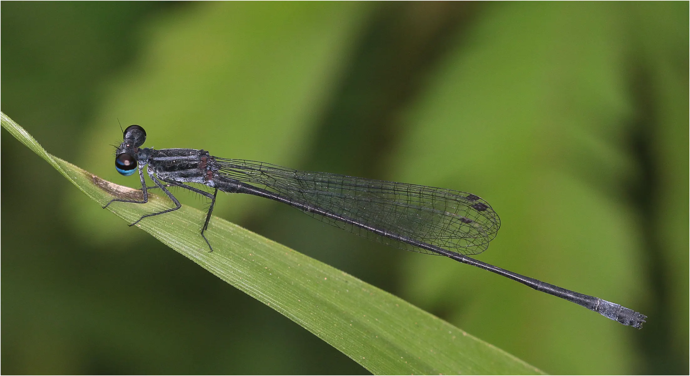 Nous avons rencontré les 4 espèces attendues. Elattoneura nigra ne pose pas de problème d’identification, les autres ont soit les pattes orange, comme E. girardi, soit sont pruineux, voire très pruineux sur la face dorsale du thorax comme E. villiersi ou E. balli. Aucun autre ne montre ces yeux magnifiques, sombres et striés de deux lignes bleues.