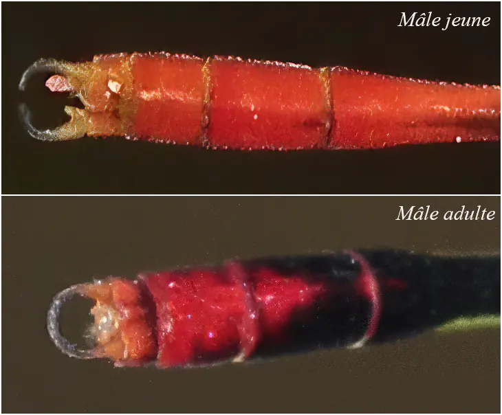 Indépendamment de la forme des appendices, qui sont donc variables, ce qui m’a aussi surpris est ce coin rouge à pointe antérieure sur le S8. Sur les sujets que j’avais rencontrés en Namibie et ceux que je trouve sur le Web, sur iNaturalist ou observation.org, c’est un coin noir à pointe distale qui décore le S8.