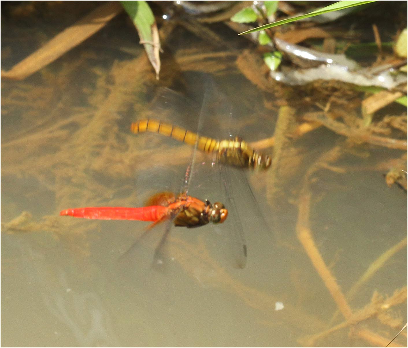 La ponte se fait souvent sous la surveillance du mâle. La femelle donne de brusque coups dans l'eau avec son abdomen, ici la dépression est spectaculaire, et projette son ou ses oeufs avec des gouttes d'eau sur la berge afin d'éviter leur dessication. Les expansions ventrales du 8° segment abdominale qu'on voit à gauche sont adpatées à cet usage.