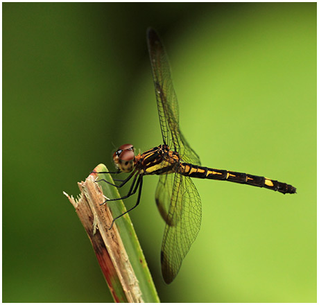 Si on retrouve pour les femelles les 2 larges bandes jaunes thoraciques, la tache métallisée sur le front est beaucoup plus réduite. Elle n'a pas les yeux bleus et la différence de coloration entre mâle et femelle est très importante. Le 31 août 2012 sur Old Gamboa Road, région du canal.